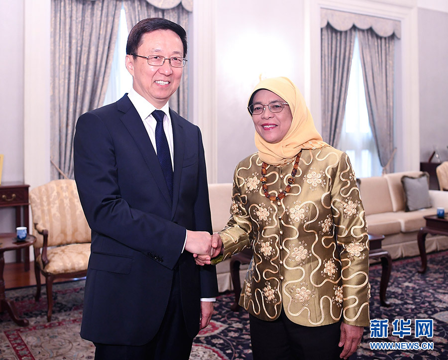 在同新方領(lǐng)導(dǎo)人會(huì)見時(shí),韓正轉(zhuǎn)達(dá)了習(xí)近平主席、李克強(qiáng)總理對(duì)哈莉瑪總統(tǒng)、李顯龍總理的親切問候,哈莉瑪和李顯龍表示感謝并請(qǐng)韓正轉(zhuǎn)達(dá)他們對(duì)中國(guó)領(lǐng)導(dǎo)人的良好祝愿。