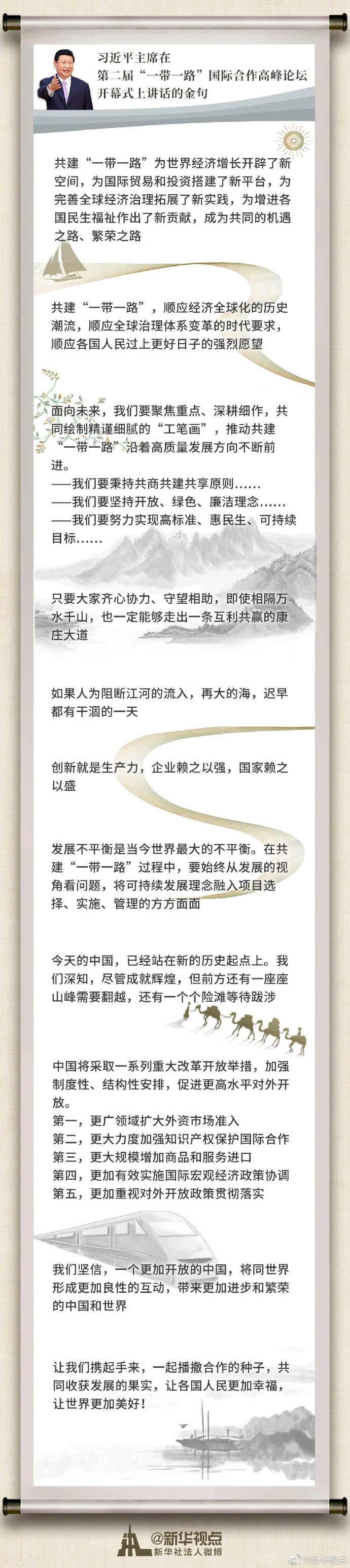 國家主席習(xí)近平26日上午在北京出席第二屆“一帶一路”國際合作高峰論壇開幕式并發(fā)表主旨演講。速覽習(xí)近平主席講話金句↓ ?????
