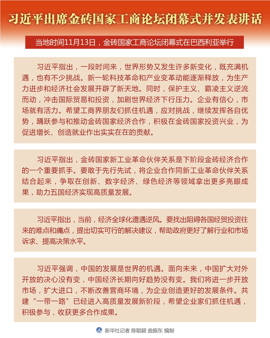 當(dāng)?shù)貢r(shí)間11月13日,金磚國(guó)家工商論壇閉幕式在巴西利亞舉行。國(guó)家主席習(xí)近平出席并發(fā)表講話。 新華社記者 謝環(huán)馳 攝