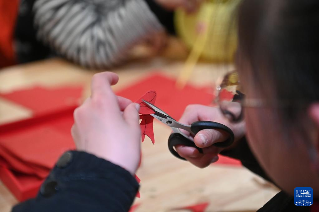 2月4日,小朋友在体验剪纸。