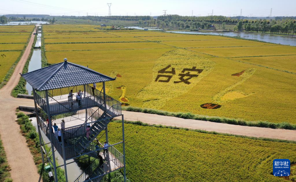初秋时节,辽宁省鞍山市台安县辽河文化旅游景区的稻田画吸引不少游客前来参观游览。由多种颜色组成的巨型稻田画勾勒出丰收壮美景象。