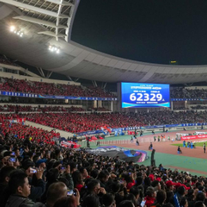 2025年11月1日,2025江苏省城市足球联赛(“苏超”)决赛现场大屏幕显示共有62329名观众观赛。新华社记者 李博 摄