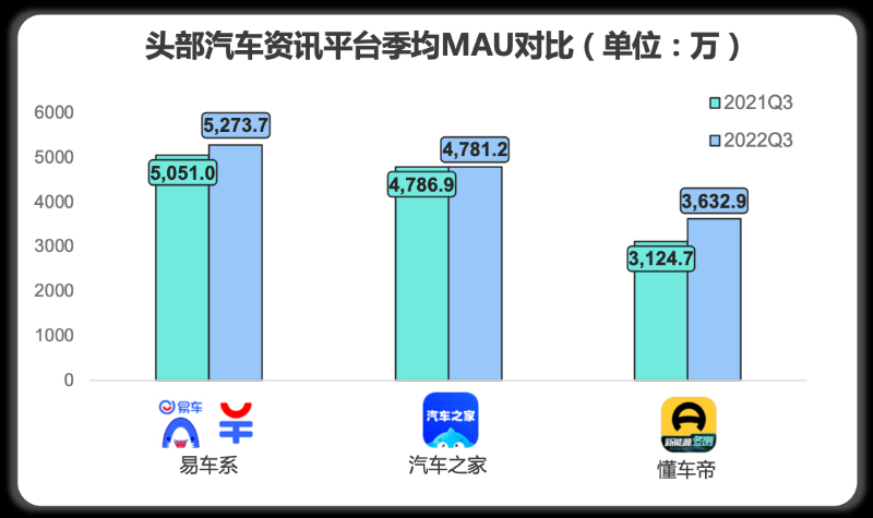 今年第三季度,各大汽车资讯平台继续保持月活用户的高位水平发展,与2021年第三季度相比均取得用户规模的扩大,行业内竞争依然激烈。