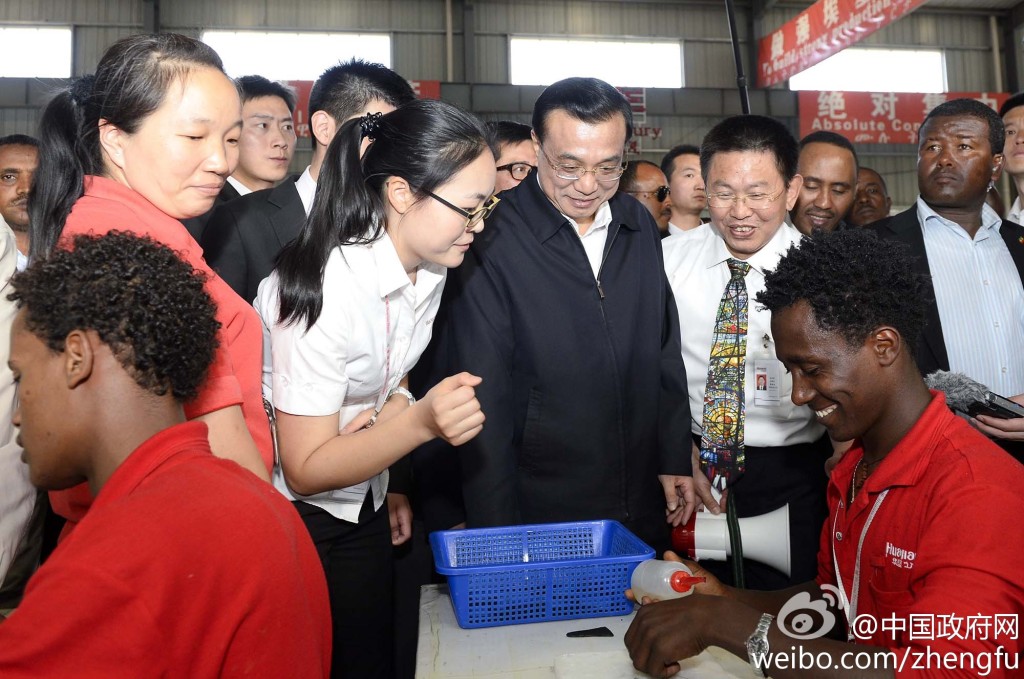 新華網(wǎng)北京5月6日電 據(jù)中國政府網(wǎng)微博報(bào)道,5日下午,李克強(qiáng)在埃塞總理陪同下參觀東方工業(yè)園。該園由中方投資興建,目前已為當(dāng)?shù)靥峁?000余個(gè)就業(yè)崗位。李克強(qiáng)說,中國愿意把可轉(zhuǎn)移的勞動密集型產(chǎn)業(yè)優(yōu)先轉(zhuǎn)移到非洲,帶動當(dāng)?shù)鼐蜆I(yè),促進(jìn)發(fā)展,增強(qiáng)非洲自我發(fā)展能力,造福雙方人民。