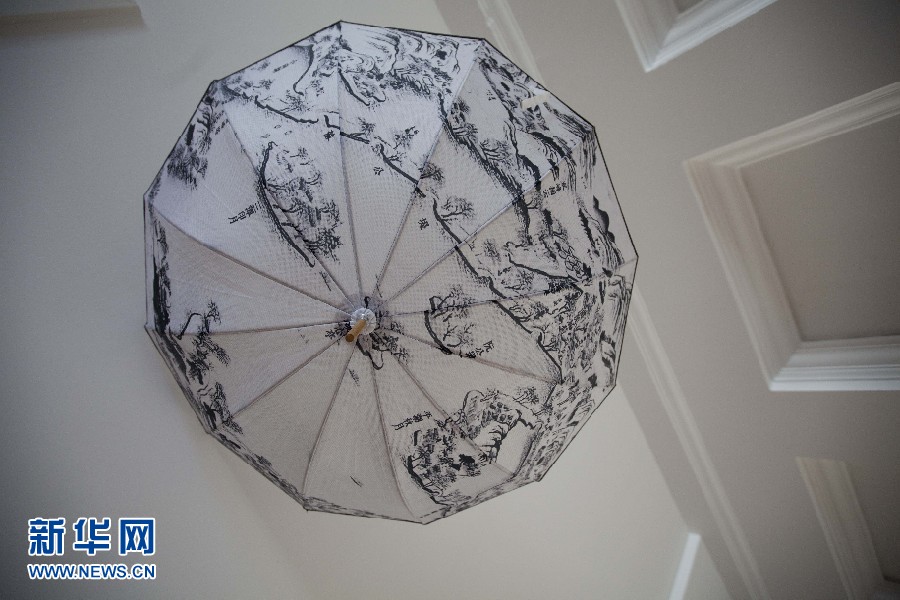 圖為10日所拍攝的“融?工藝設(shè)計(jì)生活”設(shè)計(jì)展上的一把糊傘。