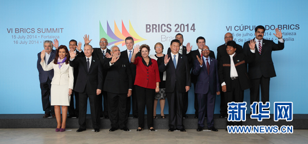 ????新華網(wǎng)巴西利亞7月16日電(記者陳威華、錢(qián)彤)7月16日,金磚國(guó)家同南美國(guó)家領(lǐng)導(dǎo)人對(duì)話(huà)會(huì)在巴西利亞舉行。中國(guó)國(guó)家主席習(xí)近平、巴西總統(tǒng)羅塞夫、俄羅斯總統(tǒng)普京、印度總理莫迪、南非總統(tǒng)祖馬以及蘇里南總統(tǒng)鮑特塞、阿根廷總統(tǒng)克里斯蒂娜、玻利維亞總統(tǒng)莫拉萊斯、哥倫比亞總統(tǒng)桑托斯、智利總統(tǒng)巴切萊特、厄瓜多爾總統(tǒng)科雷亞、圭亞那總統(tǒng)拉莫塔爾、巴拉圭總統(tǒng)卡特斯、秘魯總統(tǒng)烏馬拉、烏拉圭總統(tǒng)穆???、委內(nèi)瑞拉總統(tǒng)馬杜羅等南美國(guó)家領(lǐng)導(dǎo)人共同出席。