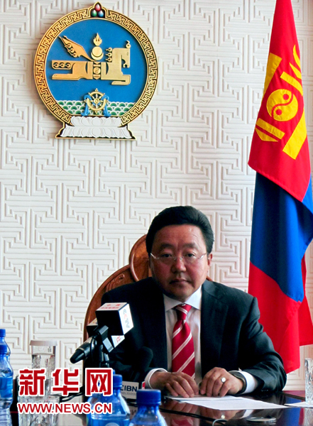??? 8月15日,蒙古國總統(tǒng)額勒貝格道爾吉在烏蘭巴托接受中國新聞代表團(tuán)的聯(lián)合采訪。新華社記者馮堅攝