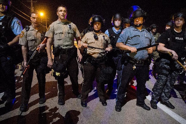 ??? 8月19日,警察在美國(guó)密蘇里州弗格森警戒。當(dāng)日,繼18歲黑人青年邁克爾·布朗9日下午被警方射殺后,密蘇里州圣路易斯市北部一非洲裔男子19日中午因涉嫌持刀襲警,被警察擊斃,導(dǎo)致弗格森街頭抗議升級(jí)。新華社發(fā)(沈霆攝)