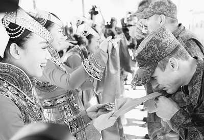2014年8月16日,在內(nèi)蒙古自治區(qū)朱日和訓(xùn)練基地火車站,來自俄羅斯的參演實(shí)兵部隊(duì)官兵在歡迎儀式上接受蒙古族傳統(tǒng)迎賓禮。
