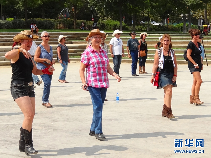 ??? 9月14日,一個陽光燦爛天氣晴朗的禮拜天上午,在西班牙巴塞羅那一處居民區(qū)的空地上,一群大叔大媽們歡快地組團跳舞。頭戴牛仔帽、身穿T恤仔褲、腳踏長筒靴,大叔大媽們顯得格外“有范兒”。