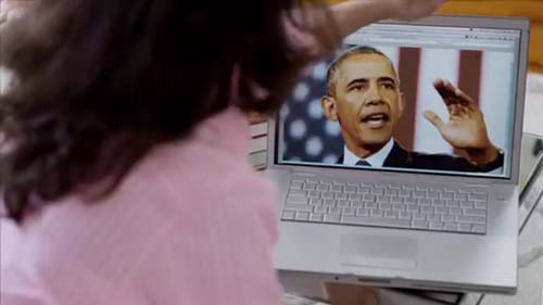????剎那間,鏡頭切換到女子的筆記本電腦上:美國(guó)總統(tǒng)奧巴馬的頭像鋪滿了全屏。