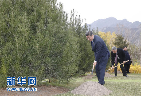 11月11日,國家主席習(xí)近平同亞太經(jīng)合組織經(jīng)濟(jì)體領(lǐng)導(dǎo)人或代表一道,在雁棲島上的夏園共同種下21棵白皮松,紀(jì)念亞太經(jīng)合組織成立25周年,表達(dá)對亞太互信、包容、合作、共贏的良好祝愿。