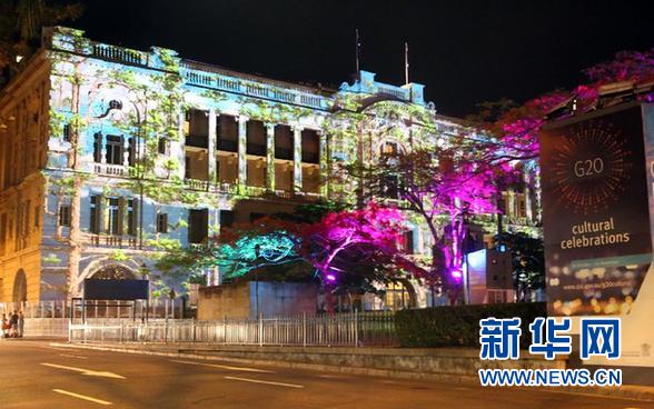 ????這是11月15日在澳大利亞布里斯班拍攝的夜景。當(dāng)日,二十國集團(tuán)領(lǐng)導(dǎo)人第九次峰會(huì)在澳大利亞布里斯班舉行。入夜,布里斯班街頭部分建筑披上了彩色的“外衣”。 新華社記者 趙丹惠 攝
