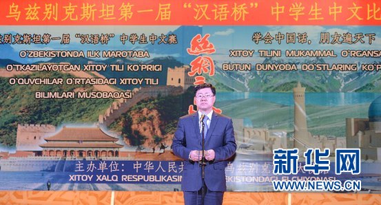 中國駐烏茲別克斯坦大使館孫立杰大使在出席烏茲別克斯坦第一屆“漢語橋”中學(xué)生中文比賽。