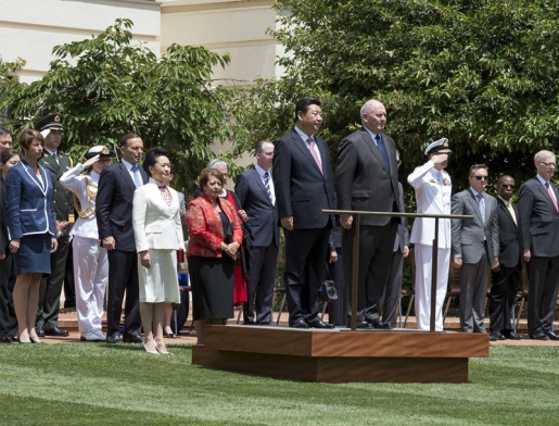 ??? 11月17日,澳大利亞總督科斯格羅夫在總督府草坪為習(xí)近平舉行隆重歡迎儀式。習(xí)近平和夫人彭麗媛抵達(dá)時,受到科斯格羅夫總督夫婦熱情迎接。新華社記者李學(xué)仁攝