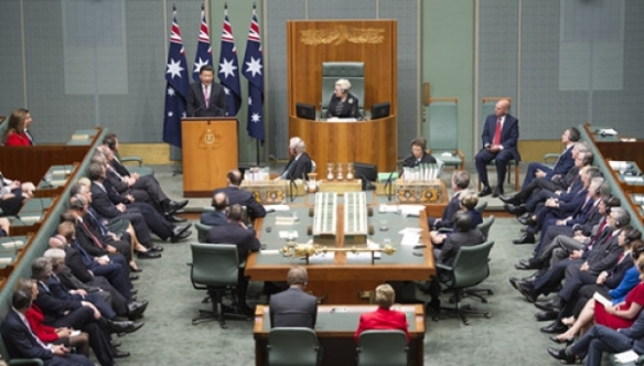 ????這次在澳大利亞,“掌聲響起來”的地方,是堪培拉的標(biāo)志性建筑——澳聯(lián)邦參眾兩院所在議會(huì)大廈的眾議院會(huì)議廳。演講的聽眾?自然主要是議員先生和女士們啦,還有陪同出席演講的阿博特總理、帕里參議長、工黨領(lǐng)袖肖滕,以及主持人畢曉普眾議長。