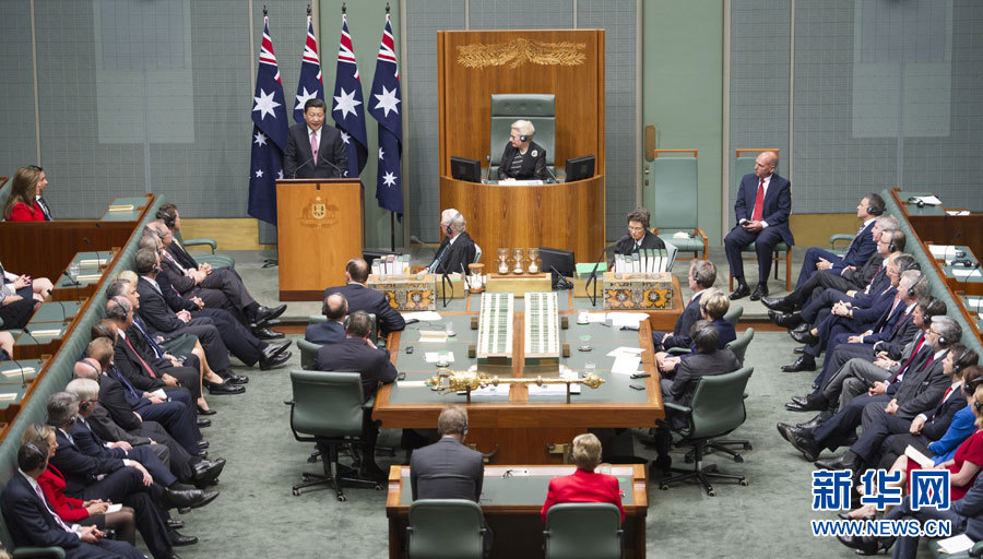 ????? ?11月17日,國(guó)家主席習(xí)近平在澳大利亞聯(lián)邦議會(huì)發(fā)表題為《攜手追尋中澳發(fā)展夢(mèng)想 并肩實(shí)現(xiàn)地區(qū)繁榮穩(wěn)定》的重要演講。 新華社記者 謝環(huán)馳攝