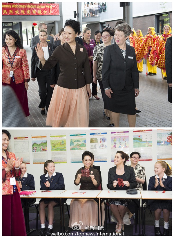??? 新華網(wǎng)北京11月19日電 據(jù)新華社“新國際”微博報道,習(xí)近平主席夫人彭麗媛19日在悉尼參觀育文武女子學(xué)校,在舞龍隊引導(dǎo)下來到孔子課堂?!鞍兹找郎奖M……”16名女孩朗誦《登鸛雀樓》,還學(xué)打中國結(jié)、制作剪紙、繡織漢字“中澳友誼長存”。彭麗媛拿起剪刀,剪出一個“?!弊帧?