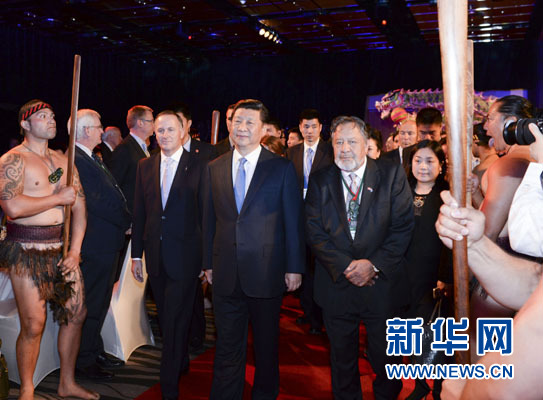 ????習(xí)近平和夫人彭麗媛抵達(dá)時(shí),新西蘭總理約翰·基夫婦迎接,毛利族代表以傳統(tǒng)方式歡迎。在毛利族勇士和中國舞龍引領(lǐng)下,習(xí)近平和彭麗媛步入大廳,全場起立鼓掌。毛利族青年用歌聲表達(dá)喜悅和友誼。
