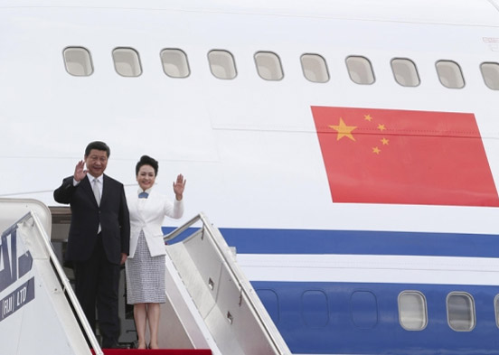 ??? 11月21日,國(guó)家主席習(xí)近平抵達(dá)楠迪。圖為習(xí)近平和夫人彭麗媛步出機(jī)艙。(攝影 丁林)