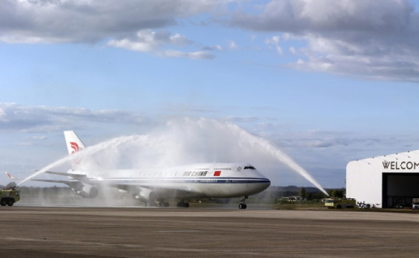 ????11月21日,習(xí)近平乘坐的專機(jī)在楠迪國(guó)際機(jī)場(chǎng)跑道上滑行穿過(guò)“水門(mén)”,這是當(dāng)?shù)亟o予最尊貴客人的禮遇,表達(dá)為客人“洗塵”。 (攝影 丁林)