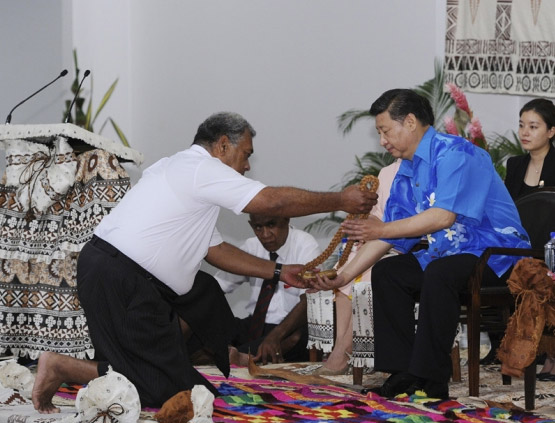 ????習(xí)主席在開(kāi)場(chǎng)白中,首先就提到了東道主對(duì)中國(guó)代表團(tuán)的熱情接待和周到安排:“昨天下飛機(jī),歡迎儀式很隆重。接著,又安排了具有斐濟(jì)民族特色的歡迎儀式和盛大的歡迎晚宴。我再一次對(duì)總理先生和斐濟(jì)政府表示感謝?!?/font>