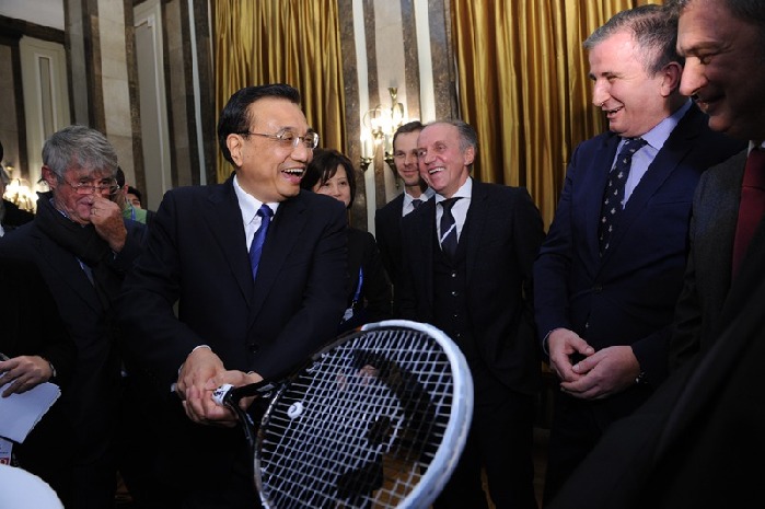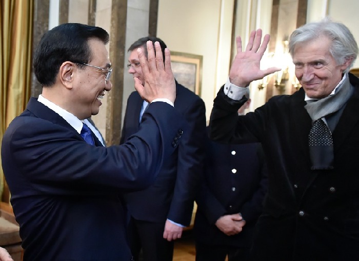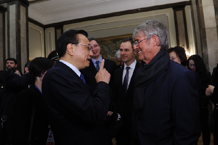 李克強(qiáng)與電影《瓦爾特保衛(wèi)薩拉熱窩》中“吉斯”的扮演者“對(duì)暗號(hào)”。中新社 劉震 攝