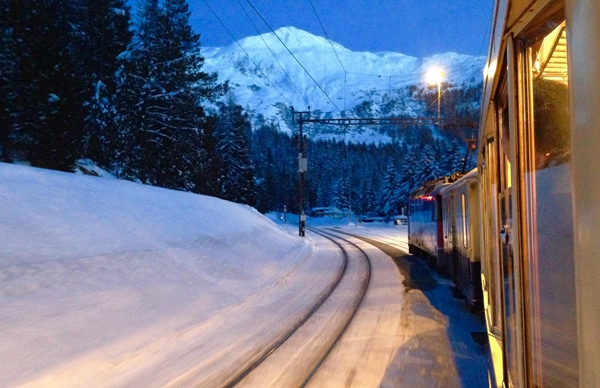 (專列在暮色中即將抵達(dá)達(dá)沃斯,窗外白雪皚皚,昏黃的燈光感覺(jué)很溫暖。攝影:王威)