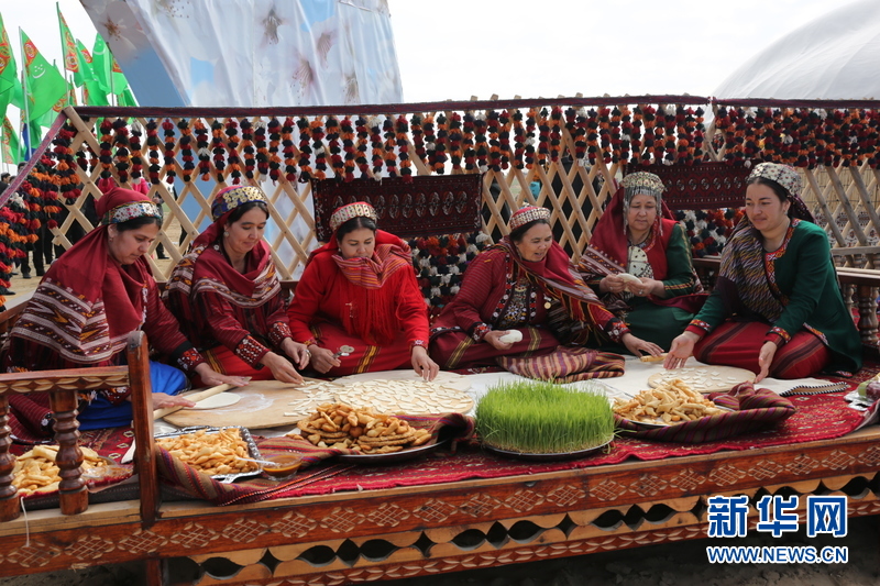 ????以往過(guò)著游牧和半游牧生活的人們?cè)诒┫?、牲畜產(chǎn)仔的時(shí)節(jié),都會(huì)以這一傳統(tǒng)佳節(jié)歡慶新生活。 21日上午,在阿什哈巴德以東40來(lái)公里處專(zhuān)門(mén)為節(jié)日搭建的場(chǎng)地上,土庫(kù)曼斯坦內(nèi)閣、外交使節(jié)、民眾和學(xué)生參加了隆重的慶?;顒?dòng)?;顒?dòng)中,青年男女、學(xué)齡前兒童載歌載舞,民眾和藝術(shù)家展示傳統(tǒng)的編織和手工藝術(shù),青年男女高高地蕩起秋千,汗血寶馬進(jìn)行馬技表演,土庫(kù)曼咬狼犬、羊群和駱駝或圍在欄子里,或被主人牽在手中,展現(xiàn)出游牧民族的生活景象。