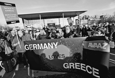 為彌合在希臘債務(wù)問題上的分歧,德國總理默克爾3月23日在柏林與到訪的希臘總理齊普拉斯會(huì)談。圖為當(dāng)天在德國柏林,有示威者打出“德國愛希臘”的標(biāo)語,呼吁雙方盡快達(dá)成共識(shí)。人民視覺