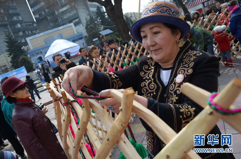 ????4月4日、5日,在阿拉木圖舉辦首界氈房節(jié)。穿著民族服裝的民間藝人搭起具有悠久傳統(tǒng)的哈薩克氈房。氈房上部為穹形,下部為圓柱形,四壁有網狀的木桿搭成整個氈房的骨架,外包白氈。氈房里四周是掛毯,地上是花氈地毯,上面刺著各種圖案,令人賞心悅目。哈薩克斯坦舉辦這次活動是為了將哈薩克氈房列入世界非物質文化遺產名錄。(文/盧敬利 圖/葉蓮娜)