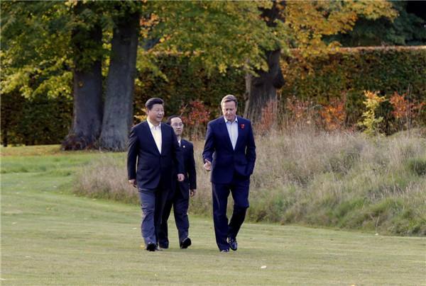 傍晚時(shí)分,習(xí)近平主席來(lái)到距倫敦市區(qū)約1小時(shí)車(chē)程的契克斯首相鄉(xiāng)間別墅,同卡梅倫一起散步,并舉行小范圍會(huì)晤。