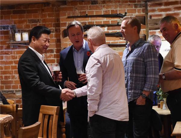10月22日,國(guó)家主席習(xí)近平在契克斯首相鄉(xiāng)間別墅同英國(guó)首相卡梅倫再次會(huì)晤。會(huì)晤結(jié)束后,習(xí)近平在卡梅倫陪同下乘車(chē)前往當(dāng)?shù)匦℃?zhèn)體驗(yàn)酒吧文化。(新華社記者饒愛(ài)民攝)