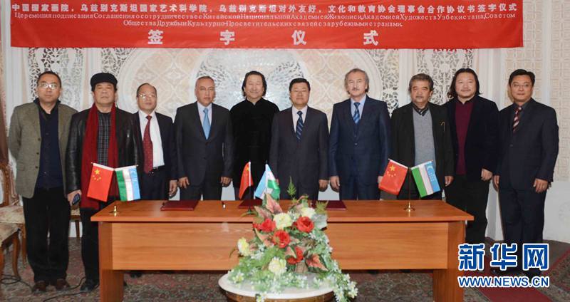 當(dāng)天上午,中國國家畫院院長楊曉陽與烏茲別克斯坦對外友協(xié)副主席阿比多夫和烏茲別克斯坦國家藝術(shù)科學(xué)院院長努爾金諾夫,在中國駐烏茲別克斯坦大使孫立杰以及烏媒體代表共同見證下,分別在協(xié)議書上簽字。協(xié)議聲明,三方將定期為兩國藝術(shù)家開展美術(shù)創(chuàng)作、研究提供條件,定期舉辦創(chuàng)作寫生、藝術(shù)展覽及學(xué)術(shù)研討等文化藝術(shù)交流活動。