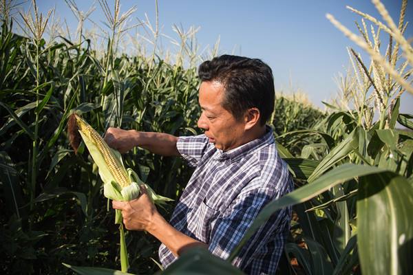 2015年11月11日,在津巴布韋奇諾伊的溫亞尼農場上,中方企業(yè)晥津公司總經理何宏順展示農場出品的青玉米。(新華社記者許林貴攝)