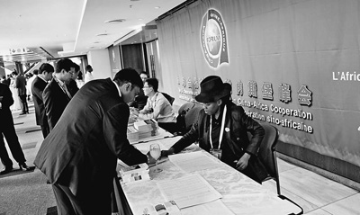 3日,印有中非合作論壇徽標(biāo),用中、英、法三種文字書寫的“中非合作論壇約翰內(nèi)斯堡峰會(huì)”及主題詞“中非攜手并進(jìn):合作共贏、共同發(fā)展”的巨幅招貼畫,將約堡桑頓會(huì)議中心裝點(diǎn)出一番全新的意境。