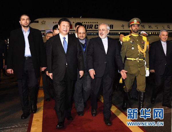 圖為1月22日,國家主席習(xí)近平乘專機(jī)抵達(dá)伊朗首都德黑蘭,開始對(duì)伊朗進(jìn)行國事訪問。這是在梅赫拉巴德機(jī)場,習(xí)近平受到伊朗外交部長扎里夫等熱情迎接。(新華社記者饒愛民攝)