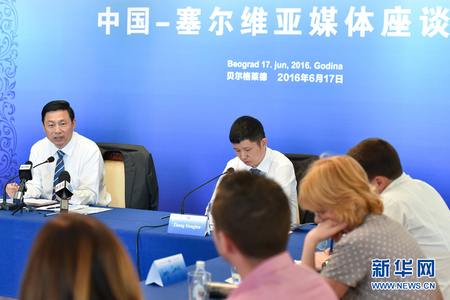 6月17日,在塞爾維亞首都貝爾格萊德召開的中國—塞爾維亞媒體座談會(huì)上,中國國務(wù)院新聞辦公室副主任郭衛(wèi)民(后左一)同與會(huì)的中塞媒體代表進(jìn)行交流。當(dāng)天,由中國國務(wù)院新聞辦公室主辦的中國—塞爾維亞媒體座談會(huì)在塞爾維亞首都貝爾格萊德舉行,中國國務(wù)院新聞辦副主任郭衛(wèi)民和來自中塞主流媒體的十多位高層人士出席。 新華網(wǎng)記者 錢一 攝