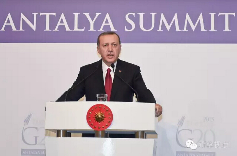 ??? 2015年11月,G20峰會在土耳其安塔利亞舉行,從安塔利亞到杭州,從地中海岸到錢塘江畔,與東道主接力棒一樣順利傳遞的,是對推動全球經(jīng)濟(jì)穩(wěn)步復(fù)蘇、實(shí)現(xiàn)可持續(xù)增長的決心?!敖影簟焙蟮闹袊?,在議題設(shè)置上既汲取了安塔利亞峰會的智慧成果,又著眼當(dāng)前、旨在長遠(yuǎn)、彰顯新意。 2015年G20安塔利亞峰會上的埃爾多安總統(tǒng)↓