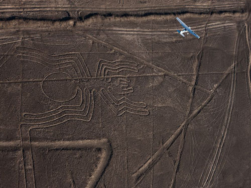 ????站在地面上的話,你幾乎看不到納斯卡線,它們由淺色泥土畫(huà)成,兩邊由深色石頭畫(huà)的線來(lái)提亮。這個(gè)地區(qū)有數(shù)量眾多的納斯卡線——長(zhǎng)達(dá)幾千米的碎片狀的三角形和矩形,非寫(xiě)實(shí)的動(dòng)物和鳥(niǎo)類圖案:一只猴子,一只禿鷹,一只完全對(duì)稱的蜘蛛,一只蜂鳥(niǎo)。