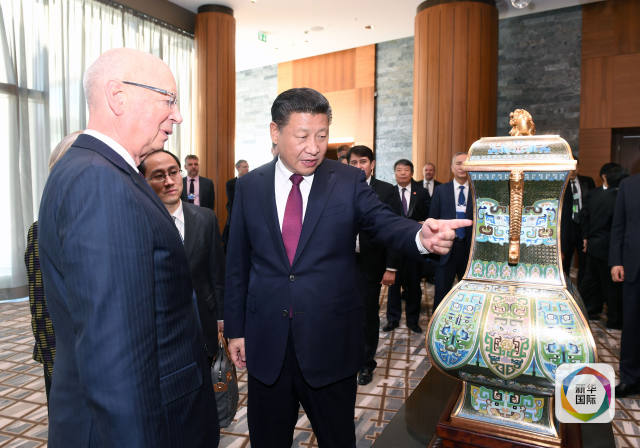 1月17日,國家主席習近平在瑞士達沃斯會見世界經(jīng)濟論壇主席施瓦布。這是習近平向施瓦布介紹中華人民共和國贈送給世界經(jīng)濟論壇的四面方尊。(新華社記者 饒愛民 攝)