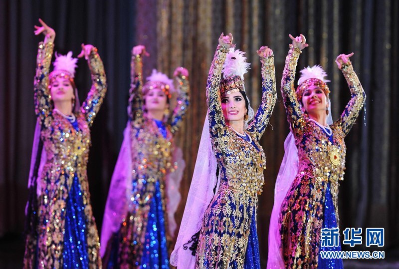 1月18日晚,烏茲別克斯坦首都塔什干人民友誼宮,烏茲別克斯坦舞蹈演員在表演中烏傳統(tǒng)舞蹈。 新華網(wǎng)記者 沙達提 攝