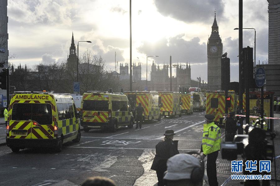 ??? 3月22日,救護(hù)車在英國倫敦的議會大廈外待命。 英國警方22日晚宣布,已有4人在倫敦市中心的襲擊事件中死亡,另有20多人受傷。新華社發(fā)(蒂姆·愛爾蘭攝)
