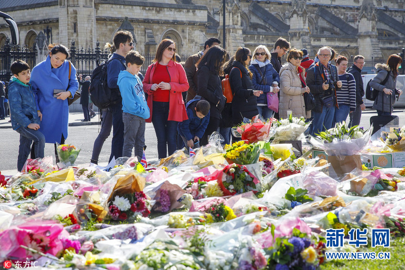 英國(guó)民眾在議會(huì)外擺放鮮花 哀悼恐襲受害者(組圖)