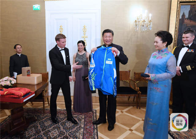 當地時間4月5日晚,國家主席習近平和芬蘭總統(tǒng)尼尼斯托在赫爾辛基共同會見剛剛參加完2017年世界花樣滑冰錦標賽的中芬兩國冰雪運動員代表。習近平夫人彭麗媛和尼尼斯托夫人豪吉歐參加會見。這是芬蘭運動員向習近平和夫人彭麗媛贈送運動衣。新華社記者饒愛民攝
