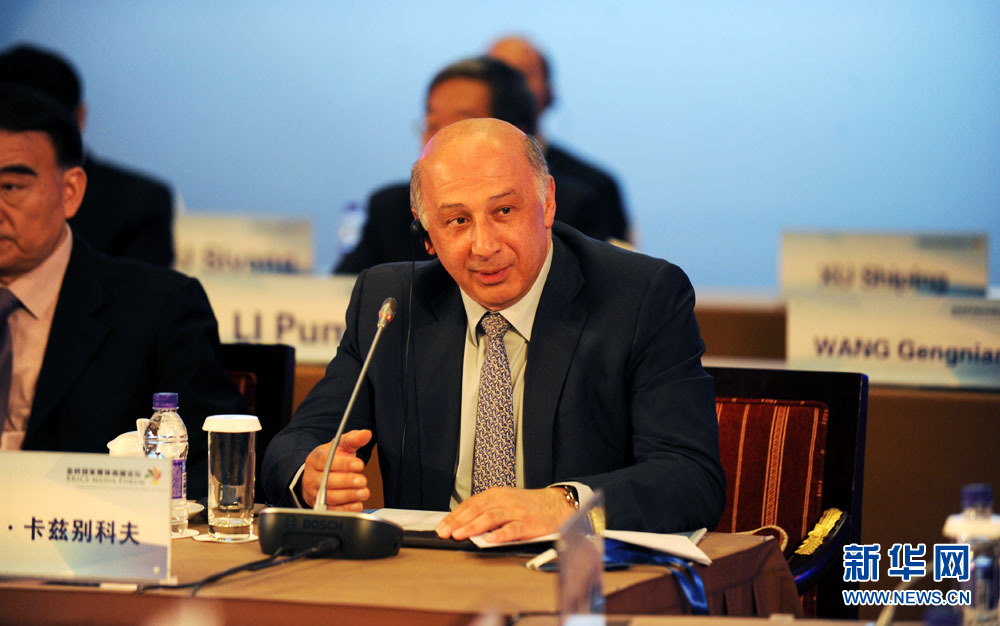 金磚國家媒體高端論壇開幕式6月8日在北京舉行。圖為金磚國家新開發(fā)銀行副行長卡茲別科夫致辭。 新華網(wǎng) 孫韜 攝