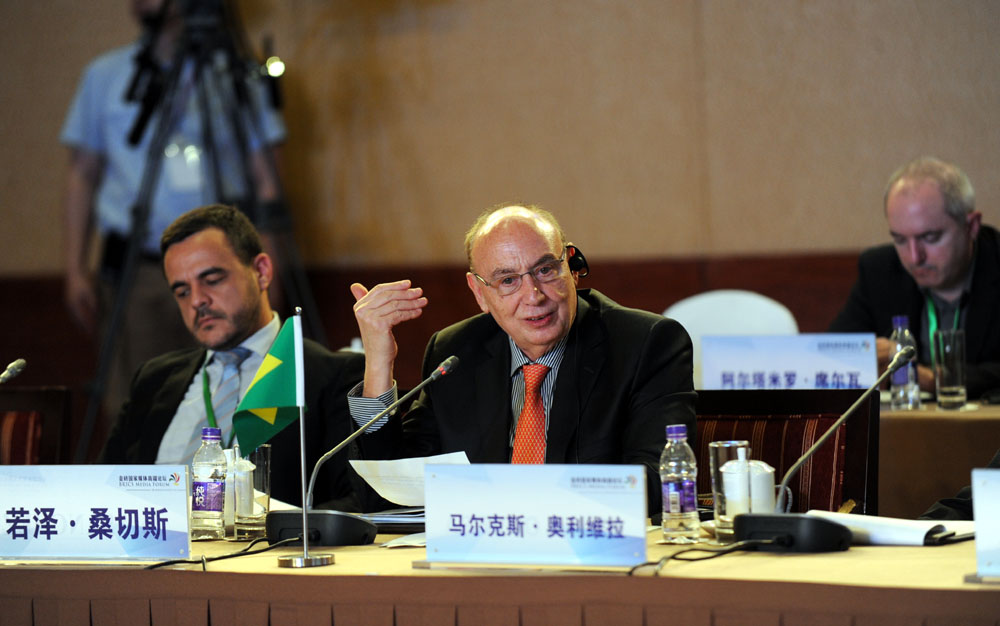 金磚國家媒體高端論壇開幕式6月8日在北京舉行。圖為論壇共同主席、巴西金融資訊集團總裁若澤·桑切斯發(fā)表講話。 新華網(wǎng) 孫韜 攝
