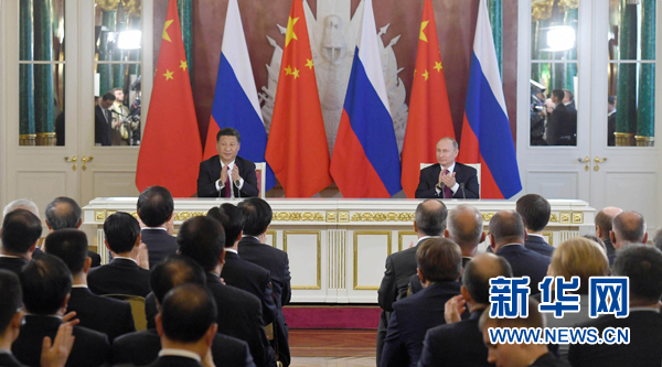 7月4日,國家主席習(xí)近平在莫斯科克里姆林宮同俄羅斯總統(tǒng)普京舉行會談。會談后,兩國元首簽署了《中華人民共和國和俄羅斯聯(lián)邦關(guān)于進(jìn)一步深化全面戰(zhàn)略協(xié)作伙伴關(guān)系的聯(lián)合聲明》《中華人民共和國和俄羅斯聯(lián)邦關(guān)于當(dāng)前世界形勢和重大國際問題的聯(lián)合聲明》,批準(zhǔn)了《〈中華人民共和國和俄羅斯聯(lián)邦睦鄰友好合作條約〉實施綱要(2017年至2020年)》并見證了《中華人民共和國外交部和俄羅斯聯(lián)邦外交部關(guān)于朝鮮半島問題的聯(lián)合聲明》以及經(jīng)貿(mào)、農(nóng)業(yè)、能源、基礎(chǔ)設(shè)施建設(shè)、金融、文化、創(chuàng)新、媒體、信息網(wǎng)絡(luò)、檢驗檢疫等領(lǐng)域多項雙邊合作文件的交換。新華社記者 謝環(huán)馳 攝