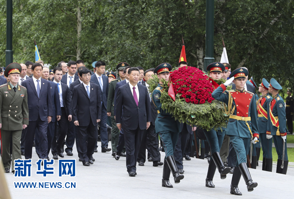 7月4日,國家主席習(xí)近平在莫斯科向俄羅斯無名烈士墓敬獻(xiàn)花圈。新華社記者 謝環(huán)馳 攝