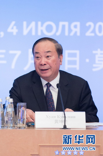 7月4日,中共中央宣傳部常務(wù)副部長黃坤明在第三屆中俄媒體論壇上發(fā)言。新華社記者 吳壯 攝